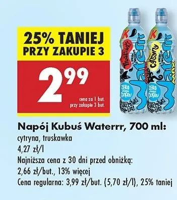 Cena produktu r贸偶ni si臋 w zale偶no艣ci od wybranego sklepu. Niestety nie posiadamy danych o aktualnych promocjach, jednak w艣r贸d archiwalnych ofert Woda cytrynowa Kubu艣 waterrr kosztuje od 1,99 z艂 do 2,99 z艂.