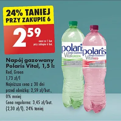 Cena produktu różni się w zależności od wybranego sklepu. Niestety nie posiadamy danych o aktualnych promocjach, jednak wśród archiwalnych ofert Woda gazowana z ekstraktami zielonej herbaty i żeńszenia Polaris kosztuje od 1,49 zł do 2,59 zł.