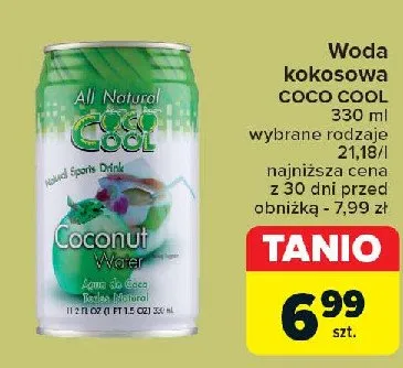Cena produktu r贸偶ni si臋 w zale偶no艣ci od wybranego sklepu. Niestety nie posiadamy danych o aktualnych promocjach, jednak w艣r贸d archiwalnych ofert Woda kokosowa Coco cool kosztuje od 4,99 z艂 do 10,99 z艂.