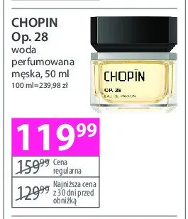 Cena produktu r贸偶ni si臋 w zale偶no艣ci od wybranego sklepu. Niestety nie posiadamy danych o aktualnych promocjach, jednak w艣r贸d archiwalnych ofert Woda perfumowana CHOPIN OP. 28 kosztuje od 119,99 z艂.