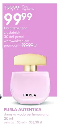 Zastanawiasz si臋, gdzie kupi膰 i ile kosztuje produkt Woda perfumowana Furla autentica? Regularnie sprawdzamy, czy jest promocja na ten produkt w Biedronka, Lidl, Kaufland, Auchan, Netto, Makro i innych sklepach. Aktualnie posiadamy 10 ofert promocyjnych na ten produkt. Ceny zaczynaj膮 si臋 od 22,99z艂!