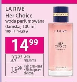 Cena produktu r贸偶ni si臋 w zale偶no艣ci od wybranego sklepu. Niestety nie posiadamy danych o aktualnych promocjach, jednak w艣r贸d archiwalnych ofert Woda perfumowana La rive her choice kosztuje od 14,99 z艂 do 19,49 z艂.