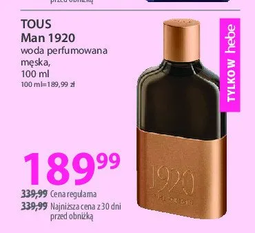 Cena produktu r贸偶ni si臋 w zale偶no艣ci od wybranego sklepu. Niestety nie posiadamy danych o aktualnych promocjach, jednak w艣r贸d archiwalnych ofert Woda perfumowana Tous 1920 the origin kosztuje od 189,99 z艂.