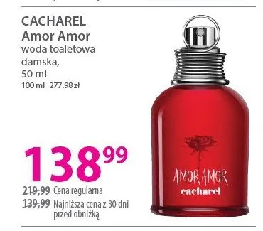 Cena produktu r贸偶ni si臋 w zale偶no艣ci od wybranego sklepu. Produkt Woda toaletowa CACHAREL AMOR AMOR mo偶esz kupi膰 w promocji ju偶 od 99,99 z艂. Najta艅sza oferta, jak膮 mamy w naszej bazie jest z sieci Drogerie Natura. Woda toaletowa CACHAREL AMOR AMOR kosztuje aktualnie 99,99 z艂. Zobacz ofert臋