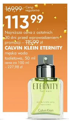 Cena produktu r贸偶ni si臋 w zale偶no艣ci od wybranego sklepu. Produkt Woda toaletowa Calvin klein eternity men mo偶esz kupi膰 w promocji ju偶 od 129,99 z艂. Najta艅sza oferta, jak膮 mamy w naszej bazie jest z sieci Drogerie Natura. Woda toaletowa Calvin klein eternity men kosztuje aktualnie 129,99 z艂. Zobacz ofert臋