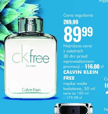 Cena produktu r贸偶ni si臋 w zale偶no艣ci od wybranego sklepu. Produkt Woda toaletowa Calvin klein free for men mo偶esz kupi膰 w promocji ju偶 od 99,99 z艂 do 109,99 z艂. Najta艅sza oferta, jak膮 mamy w naszej bazie jest z sieci Drogerie Natura. Woda toaletowa Calvin klein free for men kosztuje aktualnie 99,99 z艂. Zobacz ofert臋