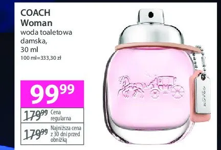 Cena produktu r贸偶ni si臋 w zale偶no艣ci od wybranego sklepu. Niestety nie posiadamy danych o aktualnych promocjach, jednak w艣r贸d archiwalnych ofert Woda toaletowa COACH WOMAN kosztuje od 99,99 z艂.