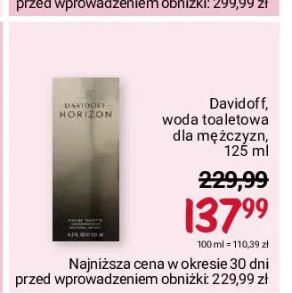 Cena produktu r贸偶ni si臋 w zale偶no艣ci od wybranego sklepu. Niestety nie posiadamy danych o aktualnych promocjach, jednak w艣r贸d archiwalnych ofert Woda toaletowa Davidoff horizon kosztuje od 79,99 z艂 do 137,99 z艂.