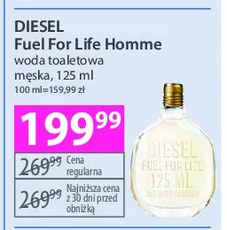 Cena produktu r贸偶ni si臋 w zale偶no艣ci od wybranego sklepu. Niestety nie posiadamy danych o aktualnych promocjach, jednak w艣r贸d archiwalnych ofert Woda toaletowa DIESEL FUEL FOR LIFE kosztuje od 89,99 z艂 do 199,99 z艂.