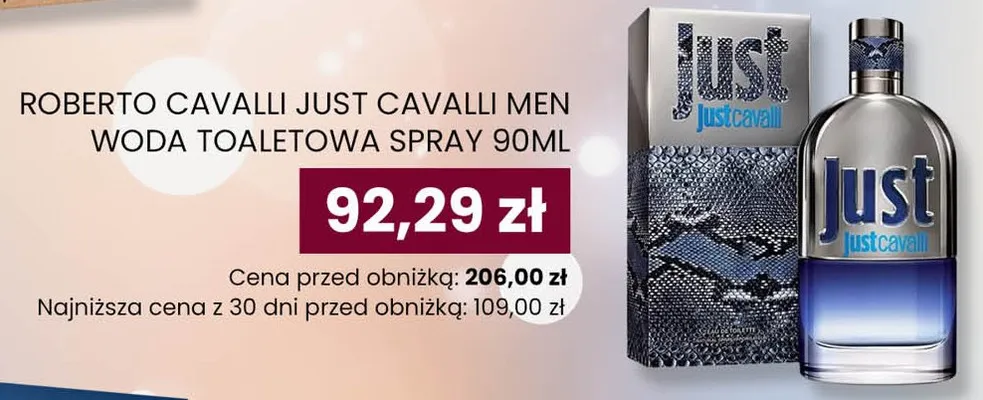 Cena produktu r贸偶ni si臋 w zale偶no艣ci od wybranego sklepu. Niestety nie posiadamy danych o aktualnych promocjach, jednak w艣r贸d archiwalnych ofert Woda toaletowa JUST CAVALLI HIM kosztuje od 92,29 z艂 do 129,99 z艂.