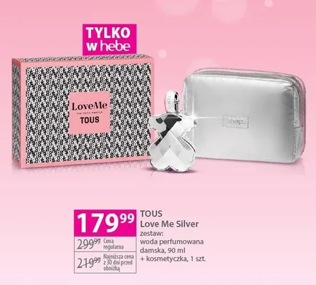 Cena produktu r贸偶ni si臋 w zale偶no艣ci od wybranego sklepu. Niestety nie posiadamy danych o aktualnych promocjach, jednak w艣r贸d archiwalnych ofert Woda toaletowa + kosmetyczka Tous love me silver kosztuje od 179,99 z艂.