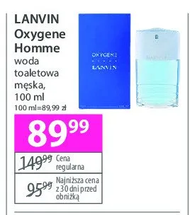 Cena produktu r贸偶ni si臋 w zale偶no艣ci od wybranego sklepu. Produkt Woda toaletowa Lanvin oxygene homme mo偶esz kupi膰 w promocji ju偶 od 98,99 z艂 do 109,99 z艂. Najta艅sza oferta, jak膮 mamy w naszej bazie jest z sieci Drogerie Natura. Woda toaletowa Lanvin oxygene homme kosztuje aktualnie 98,99 z艂. Zobacz ofert臋