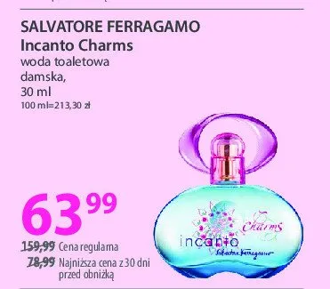 Cena produktu r贸偶ni si臋 w zale偶no艣ci od wybranego sklepu. Niestety nie posiadamy danych o aktualnych promocjach, jednak w艣r贸d archiwalnych ofert Woda toaletowa Salvatore ferragamo incanto charms kosztuje od 62,49 z艂 do 139 z艂.