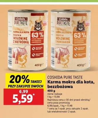 Cena produktu różni się w zależności od wybranego sklepu. Niestety nie posiadamy danych o aktualnych promocjach, jednak wśród archiwalnych ofert Wołowina z wątróbką w galarecie Coshida kosztuje od 4,49 zł do 5,99 zł.