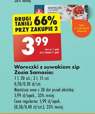 Cena produktu r贸偶ni si臋 w zale偶no艣ci od wybranego sklepu. Niestety nie posiadamy danych o aktualnych promocjach, jednak w艣r贸d archiwalnych ofert Woreczki z zamkiem 1 l Zosia samosia kosztuje od 3,99 z艂.