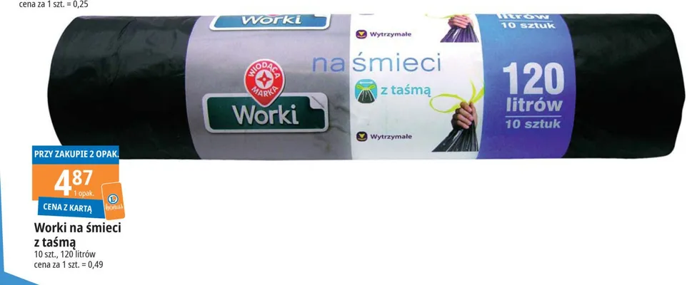 Cena produktu r贸偶ni si臋 w zale偶no艣ci od wybranego sklepu. Niestety nie posiadamy danych o aktualnych promocjach, jednak w艣r贸d archiwalnych ofert Worki na smieci 120 l Wiod膮ca marka kosztuje od 4,87 z艂.