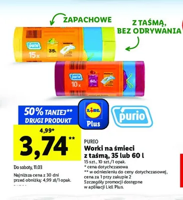 Cena produktu r贸偶ni si臋 w zale偶no艣ci od wybranego sklepu. Niestety nie posiadamy danych o aktualnych promocjach, jednak w艣r贸d archiwalnych ofert Worki na 艣mieci 60 l Purio kosztuje od 2,23 z艂 do 3,99 z艂.