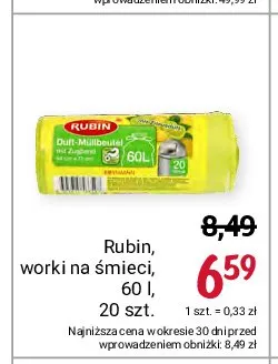 Cena produktu różni się w zależności od wybranego sklepu. Niestety nie posiadamy danych o aktualnych promocjach, jednak wśród archiwalnych ofert Worki na śmieci z taśmą ściągającą 60 l Rubin kosztuje od 5,59 zł do 6,59 zł.