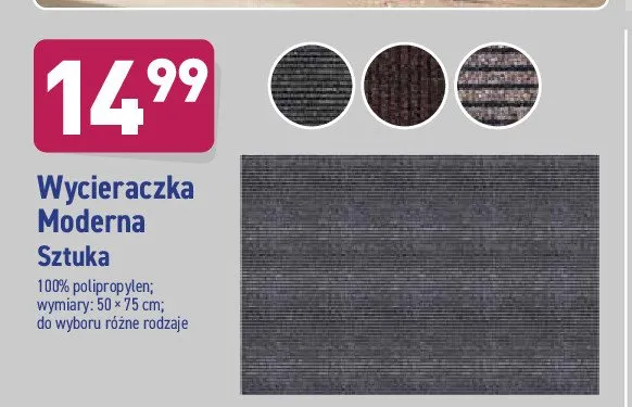 Cena produktu r贸偶ni si臋 w zale偶no艣ci od wybranego sklepu. Produkt Wycieraczka moderna 50 x 75 cm mo偶esz kupi膰 w promocji ju偶 . Najta艅sza oferta, jak膮 mamy w naszej bazie jest z sieci Selgros. Wycieraczka moderna 50 x 75 cm kosztuje aktualnie . Zobacz ofert臋