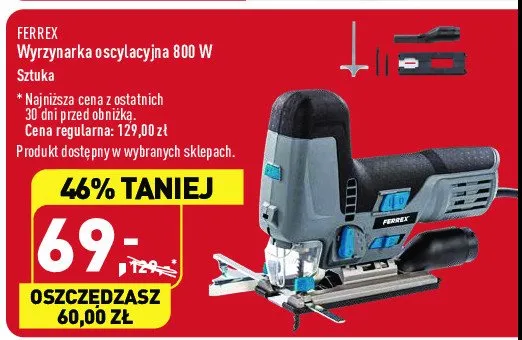 Cena produktu r贸偶ni si臋 w zale偶no艣ci od wybranego sklepu. Niestety nie posiadamy danych o aktualnych promocjach, jednak w艣r贸d archiwalnych ofert Wyrzynarka oscylacyjna 800w Ferrex kosztuje od 69 z艂 do 129 z艂.