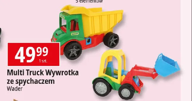 Cena produktu r贸偶ni si臋 w zale偶no艣ci od wybranego sklepu. Niestety nie posiadamy danych o aktualnych promocjach, jednak w艣r贸d archiwalnych ofert Wywrotka multi track ze spychaczem buggy Wader kosztuje od 39,99 z艂 do 45,99 z艂.