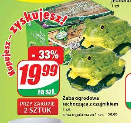Cena produktu różni się w zależności od wybranego sklepu. Niestety nie posiadamy danych o aktualnych promocjach, jednak wśród archiwalnych ofert Żaba rechocząca z czujnikiem ruchu kosztuje od 19 zł.