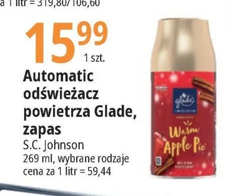 Cena produktu r贸偶ni si臋 w zale偶no艣ci od wybranego sklepu. Niestety nie posiadamy danych o aktualnych promocjach, jednak w艣r贸d archiwalnych ofert Zapas pieczone jab艂ko z cynamonem Glade by brise automatic spray kosztuje od 11,24 z艂 do 15,99 z艂.