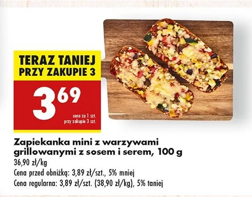 Cena produktu r贸偶ni si臋 w zale偶no艣ci od wybranego sklepu. Niestety nie posiadamy danych o aktualnych promocjach, jednak w艣r贸d archiwalnych ofert Zapiekanka mini z warzywami grillowanymi z sosem i serem kosztuje od 3,69 z艂.