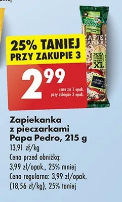 Cena produktu r贸偶ni si臋 w zale偶no艣ci od wybranego sklepu. Niestety nie posiadamy danych o aktualnych promocjach, jednak w艣r贸d archiwalnych ofert Zapiekanka z serem mozzarella i pieczarkami Papa pedro kosztuje od 2,99 z艂 do 3,49 z艂.