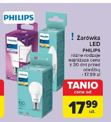 Cena produktu r贸偶ni si臋 w zale偶no艣ci od wybranego sklepu. Niestety nie posiadamy danych o aktualnych promocjach, jednak w艣r贸d archiwalnych ofert 呕ar贸wka filament 60 w Philips kosztuje od 6,35 z艂 do 21,99 z艂.