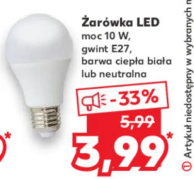 Zastanawiasz się, gdzie kupić i ile kosztuje produkt Żarówka led 10 w e27 światło ciepłe? Regularnie sprawdzamy, czy jest promocja na ten produkt w Biedronka, Lidl, Kaufland, Auchan, Netto, Makro i innych sklepach. Aktualnie posiadamy 1 ofertę promocyjną na ten produkt. Ceny zaczynają się od 3,99zł!