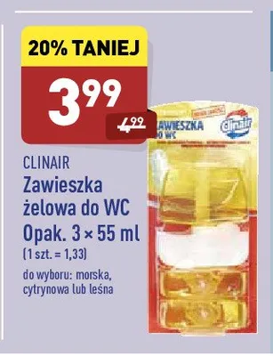 Cena produktu r贸偶ni si臋 w zale偶no艣ci od wybranego sklepu. Niestety nie posiadamy danych o aktualnych promocjach, jednak w艣r贸d archiwalnych ofert Zawieszka do wc le艣na Clinair kosztuje od 3,99 z艂.