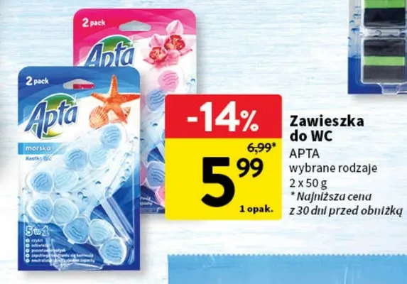Cena produktu r贸偶ni si臋 w zale偶no艣ci od wybranego sklepu. Produkt Zawieszka do wc morska Apta mo偶esz kupi膰 w promocji ju偶 od 10,99 z艂. Najta艅sza oferta, jak膮 mamy w naszej bazie jest z sieci Intermarche. Zawieszka do wc morska Apta kosztuje aktualnie 10,99 z艂. Zobacz ofert臋