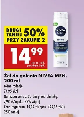 Cena produktu różni się w zależności od wybranego sklepu. Niestety nie posiadamy danych o aktualnych promocjach, jednak wśród archiwalnych ofert Żel do golenia łagodzący Nivea men sensitive kosztuje od 11,99 zł do 14,99 zł.
