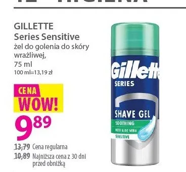 Cena produktu różni się w zależności od wybranego sklepu. Produkt Żel do golenia sensitive Gillette series możesz kupić w promocji już od 5,49 zł do 13,99 zł. Najtańsza oferta, jaką mamy w naszej bazie jest z sieci POLOmarket. Żel do golenia sensitive Gillette series kosztuje aktualnie 5,49 zł. Zobacz ofertę