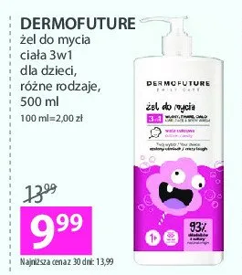 Cena produktu różni się w zależności od wybranego sklepu. Niestety nie posiadamy danych o aktualnych promocjach, jednak wśród archiwalnych ofert Żel do mycia ciała 3w1 wata cukrowa Dermofuture daily care Dermofuture precision kosztuje od 9,99 zł.