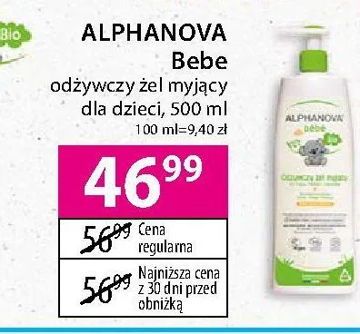 Cena produktu różni się w zależności od wybranego sklepu. Niestety nie posiadamy danych o aktualnych promocjach, jednak wśród archiwalnych ofert Żel do mycia ciała ALPHANOVA BEBE kosztuje od 37,99 zł do 56,99 zł.