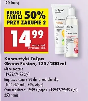 Cena produktu różni się w zależności od wybranego sklepu. Niestety nie posiadamy danych o aktualnych promocjach, jednak wśród archiwalnych ofert Żel do mycia twarzy Tołpa green power fusion kosztuje od 14,99 zł.