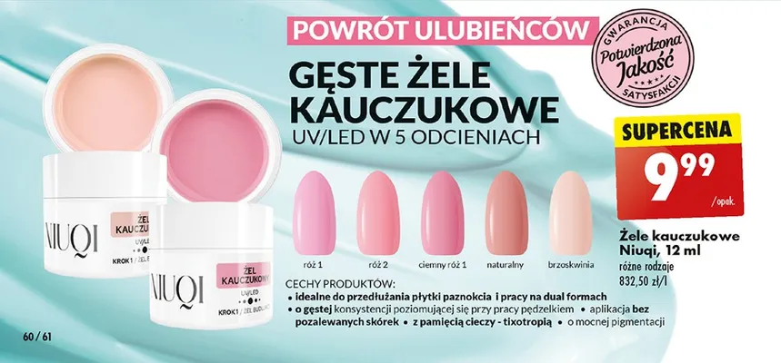 Cena produktu różni się w zależności od wybranego sklepu. Niestety nie posiadamy danych o aktualnych promocjach, jednak wśród archiwalnych ofert Żel do paznokci budujący naturalny Niuqi kosztuje od 9,99 zł.