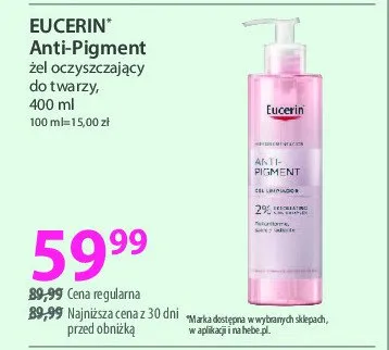 Cena produktu r贸偶ni si臋 w zale偶no艣ci od wybranego sklepu. Niestety nie posiadamy danych o aktualnych promocjach, jednak w艣r贸d archiwalnych ofert Zel do twarzy na przebarwienia EUCERIN ANTI-PIGMENT kosztuje od 59,99 z艂.