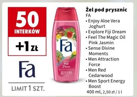 Zastanawiasz si臋, gdzie kupi膰 i ile kosztuje produkt Zel pod prysznic Fa divine moments? Regularnie sprawdzamy, czy jest promocja na ten produkt w Biedronka, Lidl, Kaufland, Auchan, Netto, Makro i innych sklepach. Aktualnie posiadamy 1 ofert臋 promocyjn膮 na ten produkt. Ceny zaczynaj膮 si臋 od 16,49z艂!