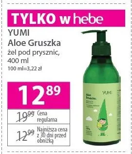 Cena produktu r贸偶ni si臋 w zale偶no艣ci od wybranego sklepu. Niestety nie posiadamy danych o aktualnych promocjach, jednak w艣r贸d archiwalnych ofert 呕el pod prysznic gruszka Yumi cosmetics kosztuje od 11,99 z艂 do 14,49 z艂.