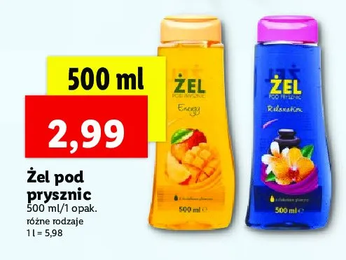 Cena produktu różni się w zależności od wybranego sklepu. Produkt Żel pod prysznic relaxation możesz kupić w promocji już od 13,49 zł do 17,99 zł. Najtańsza oferta, jaką mamy w naszej bazie jest z sieci LEWIATAN. Żel pod prysznic relaxation kosztuje aktualnie 13,49 zł. Zobacz ofertę