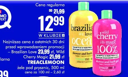 Cena produktu r贸偶ni si臋 w zale偶no艣ci od wybranego sklepu. Niestety nie posiadamy danych o aktualnych promocjach, jednak w艣r贸d archiwalnych ofert 呕el pod prysznic wild cherry magic TREACLEMOON kosztuje od 12,99 z艂 do 15,99 z艂.
