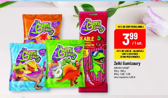 Cena produktu różni się w zależności od wybranego sklepu. Niestety nie posiadamy danych o aktualnych promocjach, jednak wśród archiwalnych ofert Żelki dżdzownice Żelki gumizaury kosztuje od 2,49 zł do 4,49 zł.