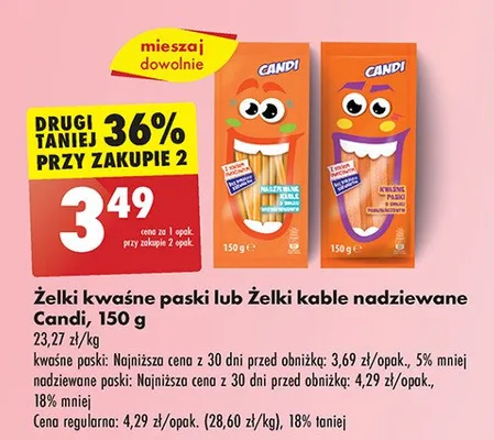 Cena produktu r贸偶ni si臋 w zale偶no艣ci od wybranego sklepu. Niestety nie posiadamy danych o aktualnych promocjach, jednak w艣r贸d archiwalnych ofert 呕elki kable brzoskwiniowe Candi kosztuje od 2,69 z艂 do 3,99 z艂.