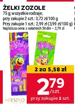 Cena produktu różni się w zależności od wybranego sklepu. Niestety nie posiadamy danych o aktualnych promocjach, jednak wśród archiwalnych ofert Żelki sticks Mieszko zozole hello żelo kosztuje od 1,5 zł do 2,79 zł.