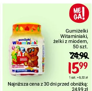 Cena produktu różni się w zależności od wybranego sklepu. Niestety nie posiadamy danych o aktualnych promocjach, jednak wśród archiwalnych ofert Żelki z miodem Gumiżelki vitaminiaki kosztuje od 15,99 zł.