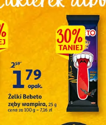 Cena produktu różni się w zależności od wybranego sklepu. Niestety nie posiadamy danych o aktualnych promocjach, jednak wśród archiwalnych ofert Żelki zęby wampira Bebeto kosztuje od 1,79 zł.