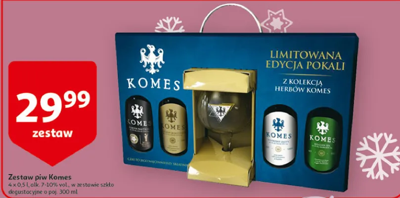 Cena produktu różni się w zależności od wybranego sklepu. Niestety nie posiadamy danych o aktualnych promocjach, jednak wśród archiwalnych ofert Zestaw 4 piw + pokal Komes poczwórny bursztynowy + potrójny złoty + porter bałtycki + belgian ipa kosztuje od 28,99 zł do 29,99 zł.